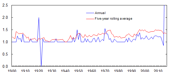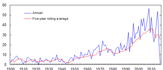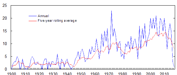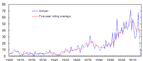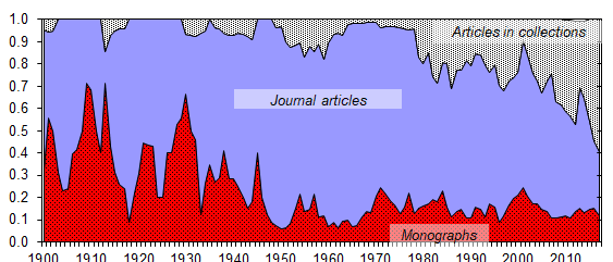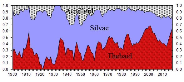 In the figures that follow, the term "journal" refers to a refereed serial publication and hence excludes articles in collections (such as supplemental volumes and Festschrifte). In Figg. 1, 2, 3, and 5, articles in collections are treated individually; they are not included in Fig. 4; and in Fig. 6, thee collections are treated as single books. Also in Fig. 6, "books" includes Programme and dissertations of all sorts. Given the different coverage of dissertations from different countries, there is some double counting in this category. The five-year rolling averages are backward-looking, such that data for 1900 refers to averaged sums from the years 1896-1900. Data do not include reviews and - especially for the most recent years - are subject to change. Figures: 1. Number of Publications on Statius